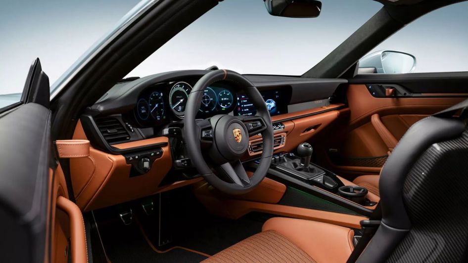 Inside, the Porsche 911 S/T continutes its legacy theme. It features carbon fibre bucket seats and vintage, partial cloth seats with pin striping.