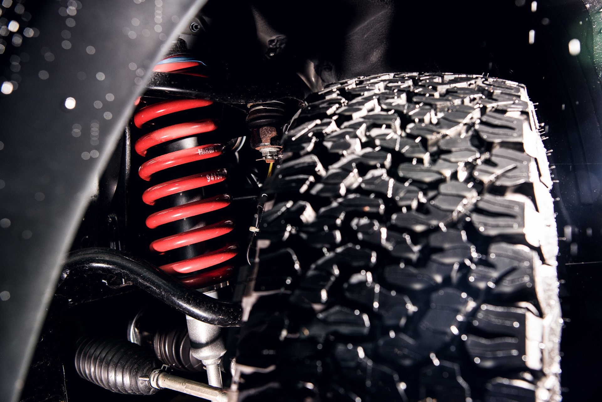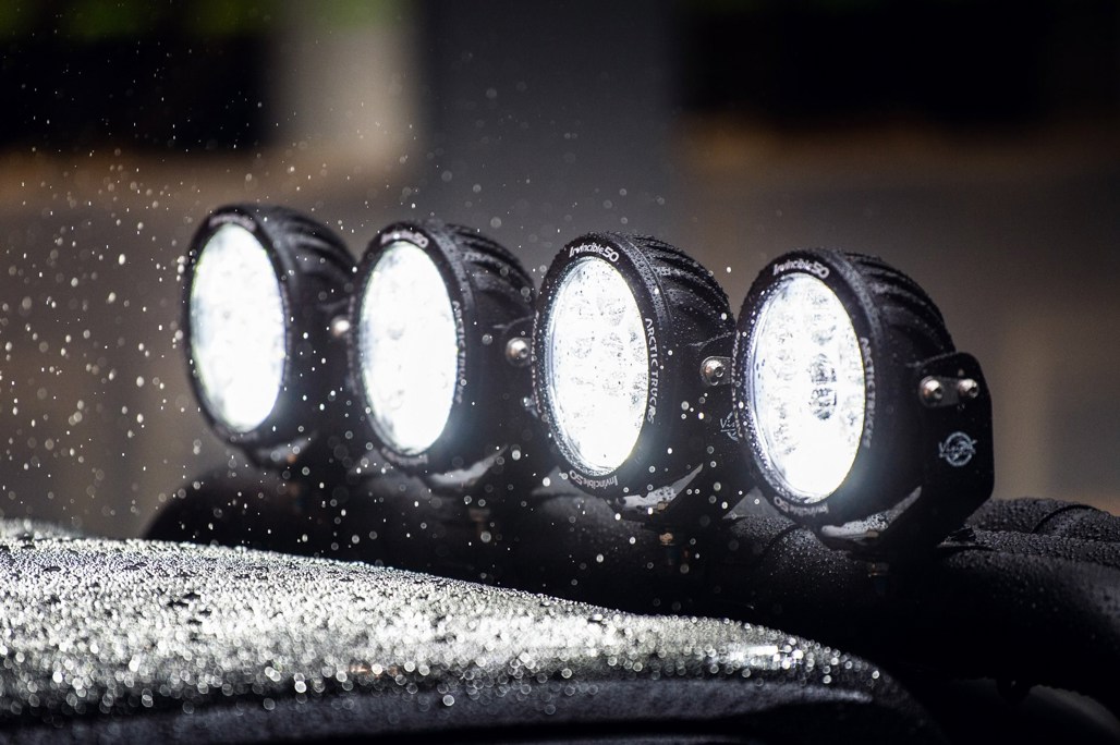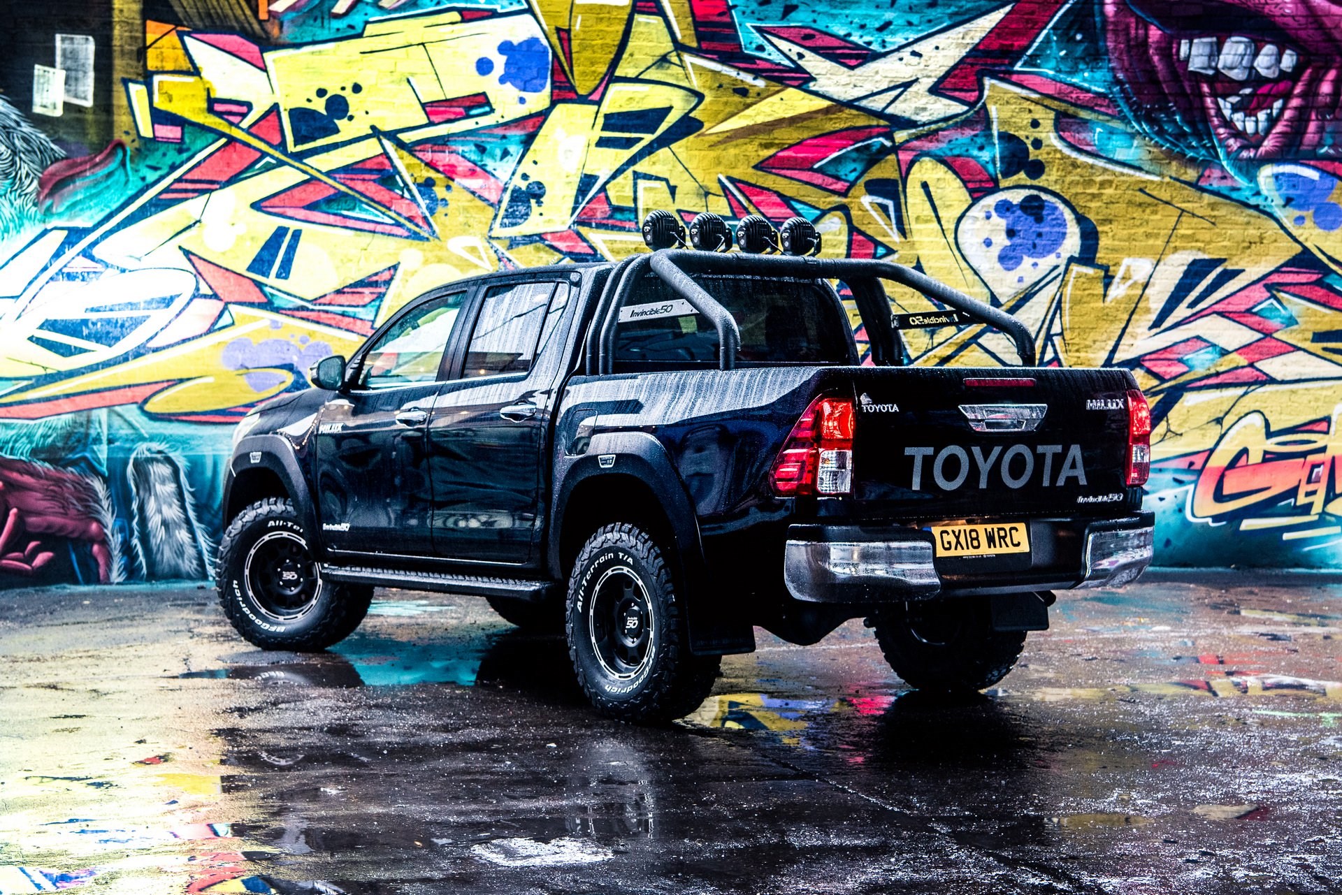 Black 16" wheels are wrapped in macho painted 265/75 BF Goodrich all-terrain tyres, with wider fenders helping accommodate the larger rubber. A vast jungle gym of a sports bar is painted black, and forms the mounting points for a row of four Vision X LED high-output overhead fog lights.