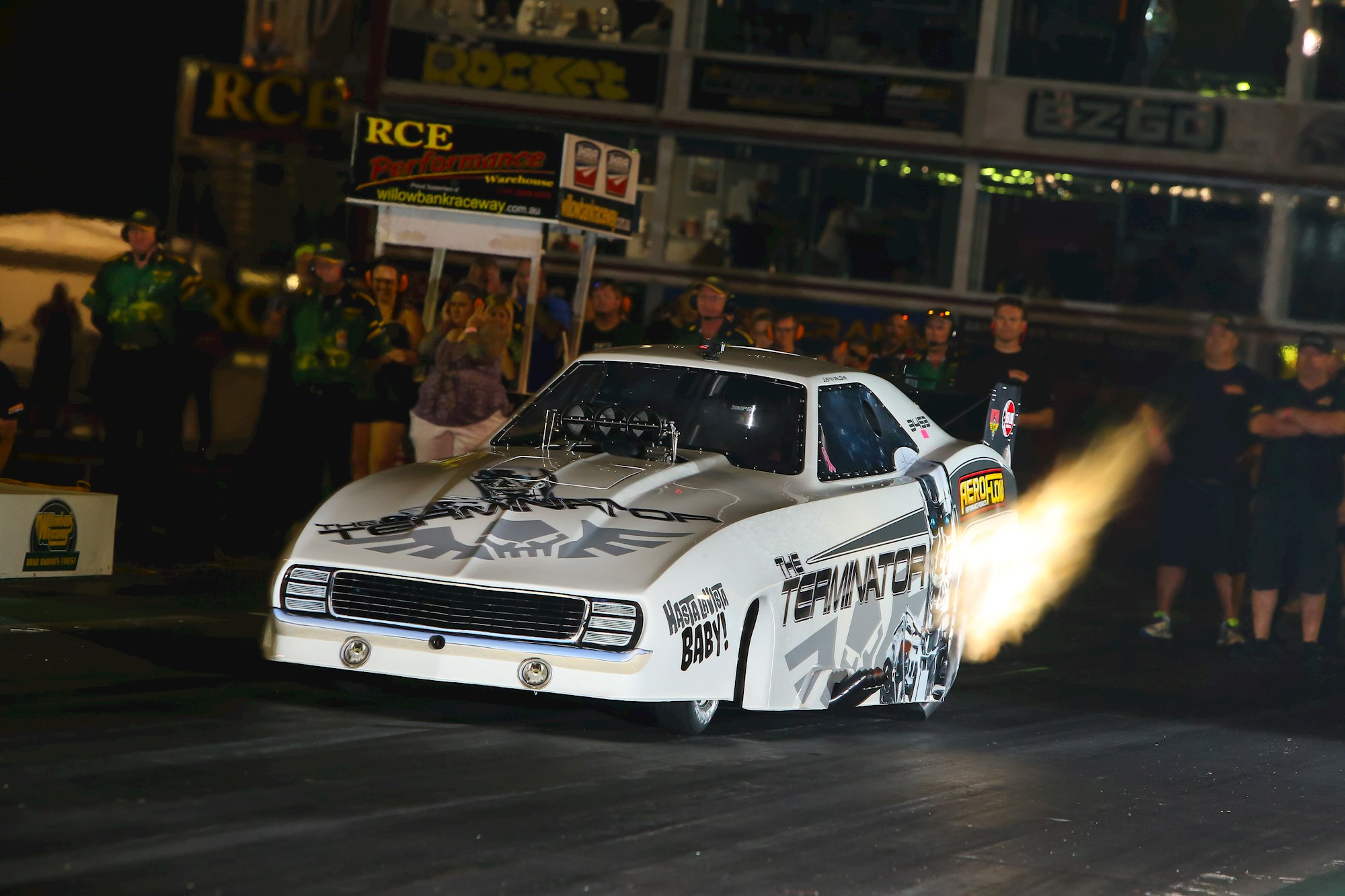 The nitro funny cars are scheduled to appear on track at 4.30pm, 6.30pm and a twilight final round at 8.30pm that promises a spectacular display of header flames as darkness approaches.