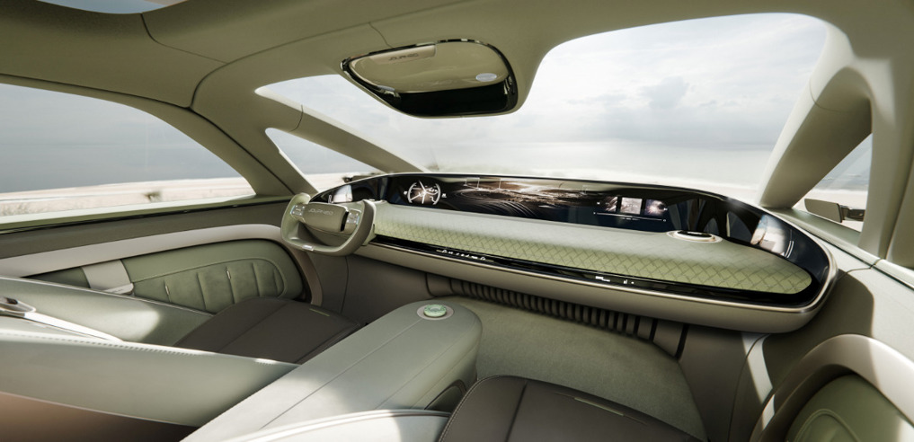 The dashboard has a minimalist design, with a yoke steering wheel and concealed air vents. The 180-degree rotating front seats and console move on concealed underfloor rails, allowing flexible arrangement of "furnishings".