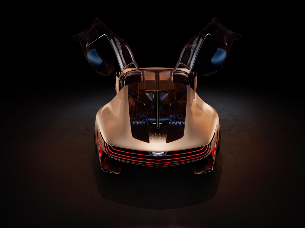 The Opulent Velocity features a low-slung silhouette, a tucked front fascia and dramatic draped surfaces that evoke the spirit of Cadillac's V-Series.R hybrid racecars. Large butterfly doors add a touch of drama and facilitate easy entry and exit.