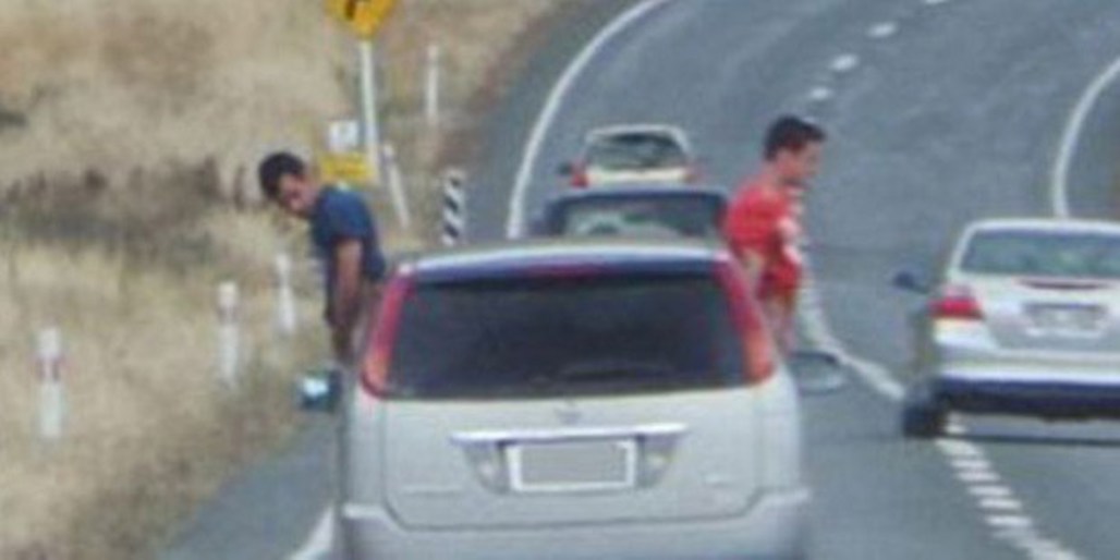 Angela and Karaan Chilton were travelling along State Highway 6 in Southland on Monday morning when they noticed the passengers hanging half their bodies out the side windows of the silver car.