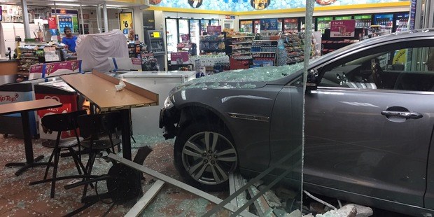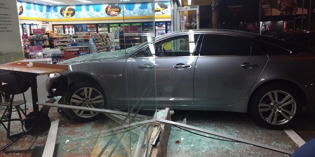This once proudly premium Jaguar crashed through the front glass doors and windows of a Mobil petrol station this morning at 4.40am, sending safety glass and metal framing everywhere. There's also a chest freezer full of bait and berley. Let's all pray that it hasn't been unplugged otherwise it'll unleash a stench of absolute destruction.