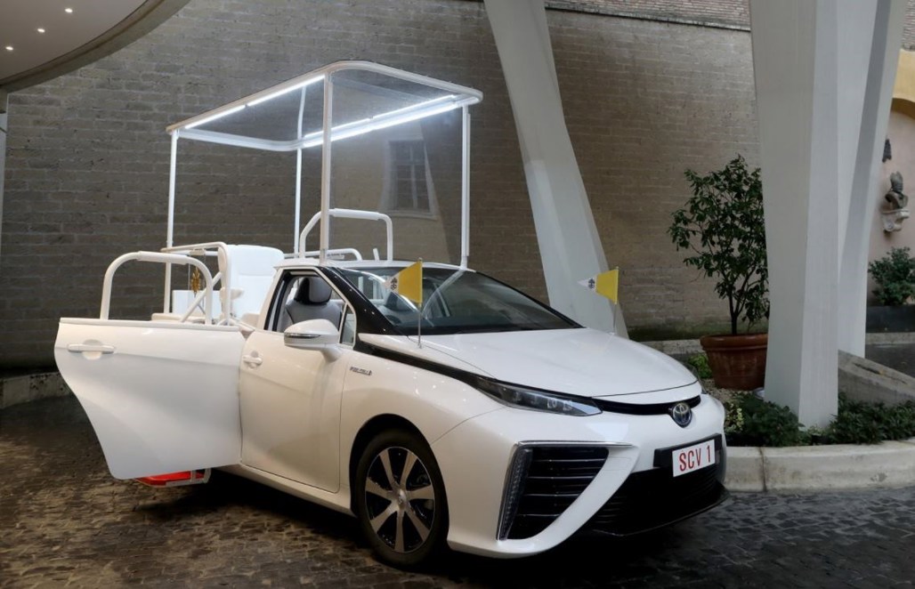 Toyota is one of these brands, and to give it a bit of publicity, one example has been extensively modified, and delivered to Pope Francis as his new 100% emissions-free Popemobile.