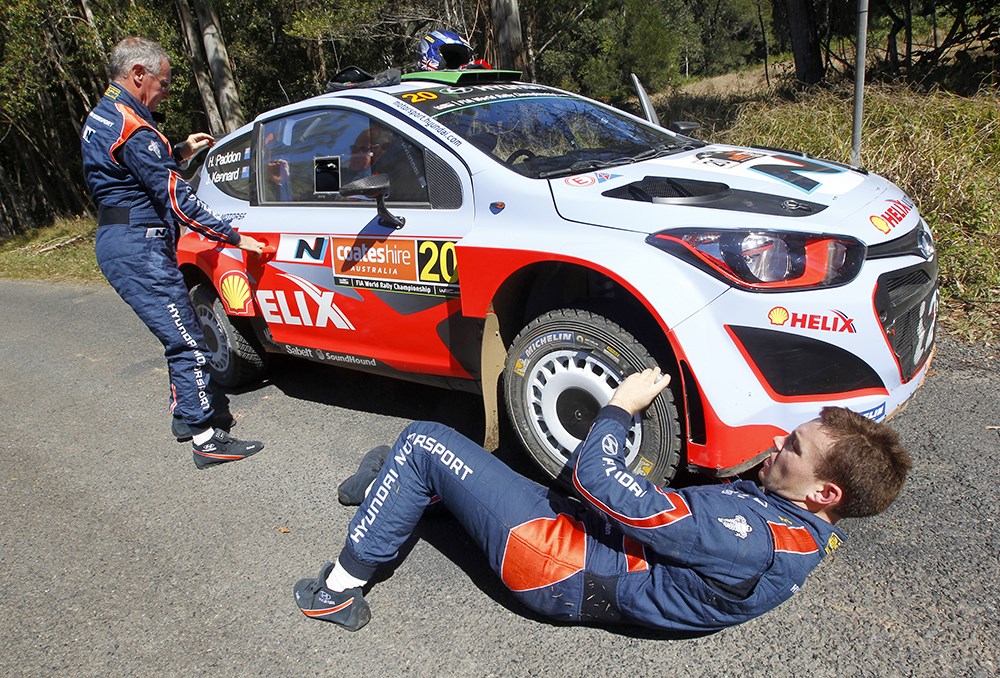Haydon Paddon (right) and co-driver John Kennard have to be pit crew when they are racing. Pictures/Hyundai Motorsport.