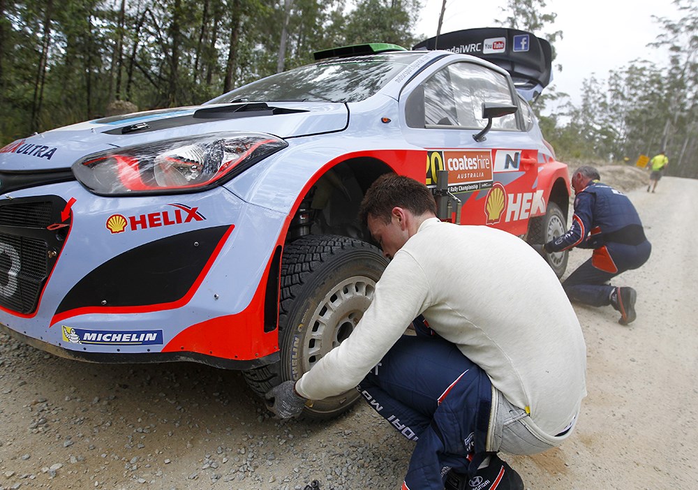 Hayen Paddon and John Kennard completing a roadside tyre swap at Rally Australia last year. Pictures/Hyundai Motorsport