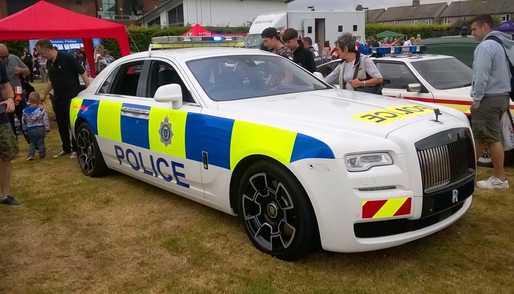 The four-door luxury saloon, finished in Andalusian White, was dress in full Sussex police decals with authentic police lights and sirens on the roof.