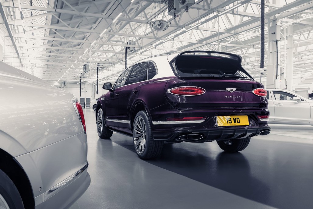 The final three models feature single-tone paint schemes: Damson, Spectre, and Magnolia. The Damson Bentayga Speed model features Autumn and Damson leather and Koa Veneer, the Spectre-painted car has Cashew and Burnt Oak leather with Dark Fiddleback Eucalyptus Veneer, and the Magnolia-coloured has Shortbread and Cricketball leather and Grand Black Veneer.