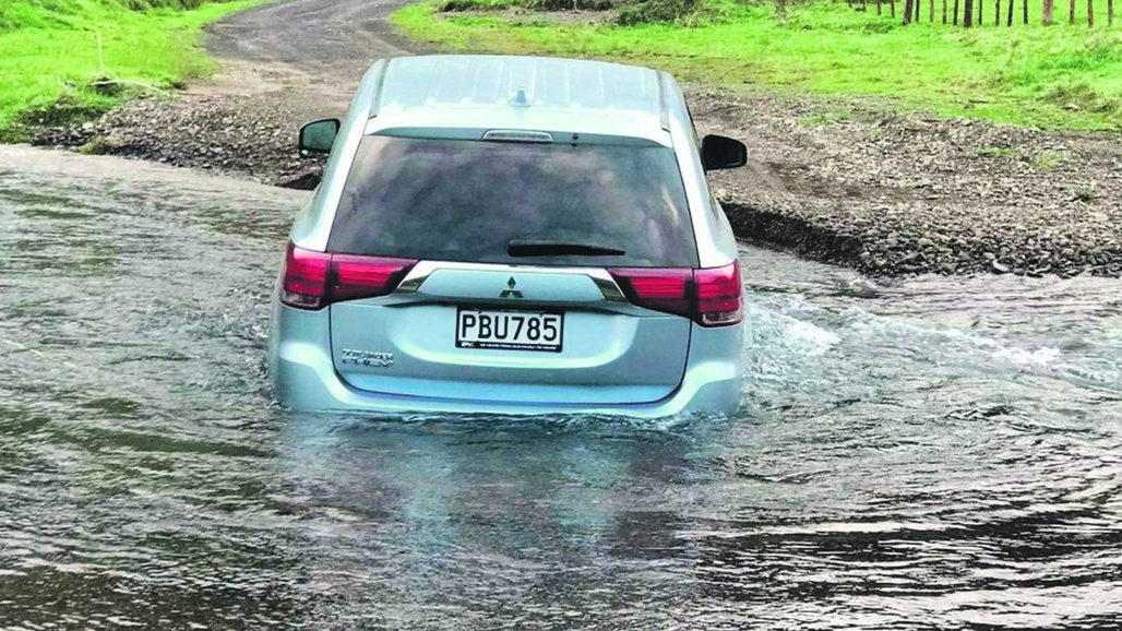 The couple live on Whitikau Rd, past Toatoa, and say their recently purchased Mitsubishi Outlander electric hybrid was written off by their insurance company after the battery was flooded from trying to cross the Papamoa Stream ford in September.