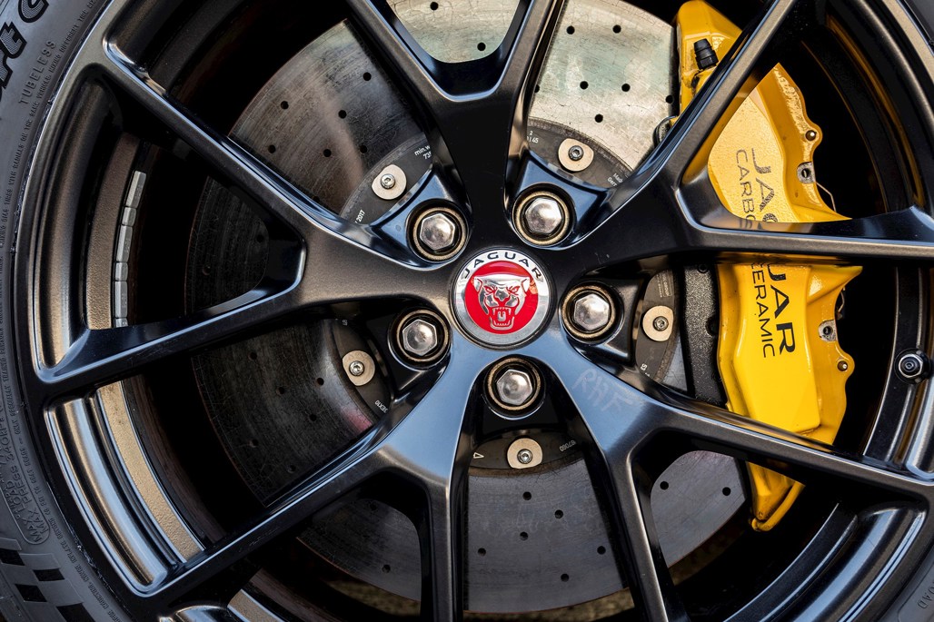 Project 8 enhances the XE’s double-wishbone front and Integral Link rear suspension with redesigned front uprights, two-piece upper wishbones, plus motorsport-derived ball joints and twin springs (height-adjustable for a 15mm lower ride on track). Project 8’s all-new Carbon Ceramic Brakes system features 400mm two-piece front discs with six-piston aluminium calipers, 396mm two-piece rear discs and uses motorsport-grade Synthetic Racing Fluid.
