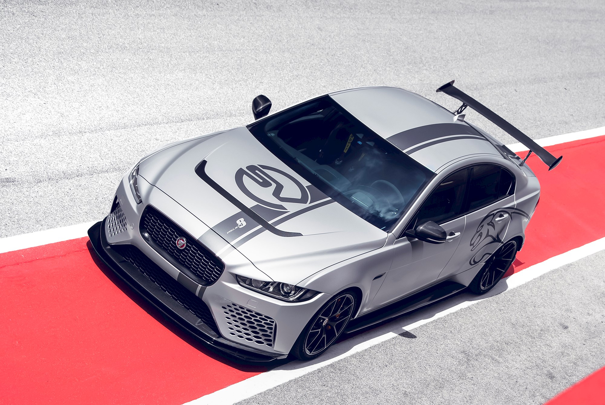 Project 8 features a number of modifications to the standard XE’s aluminium bodywork including a new carbon fibre bumper with enhanced cooling ducts, vented carbon fibre bonnet, flared wheelarches covering 20-inch forged aluminium alloy wheels, adjustable front splitter, flat underbody, rear carbon fibre bumper with integrated diffuser and an adjustable rear wing. These developments make Project 8 the lightest V8 sedan in the Jaguar range.