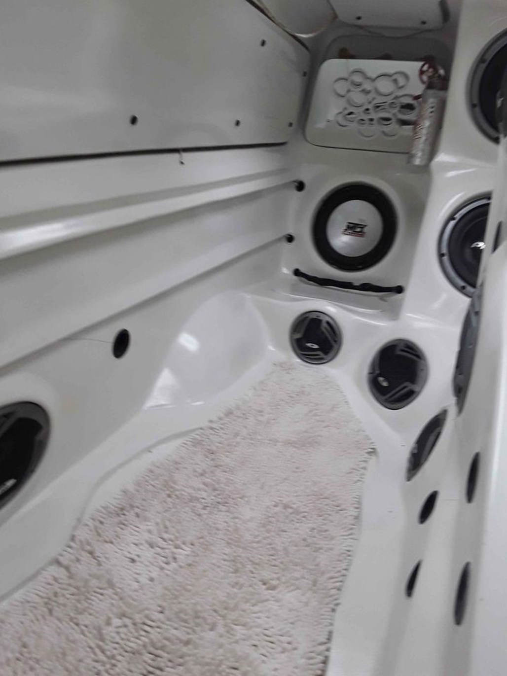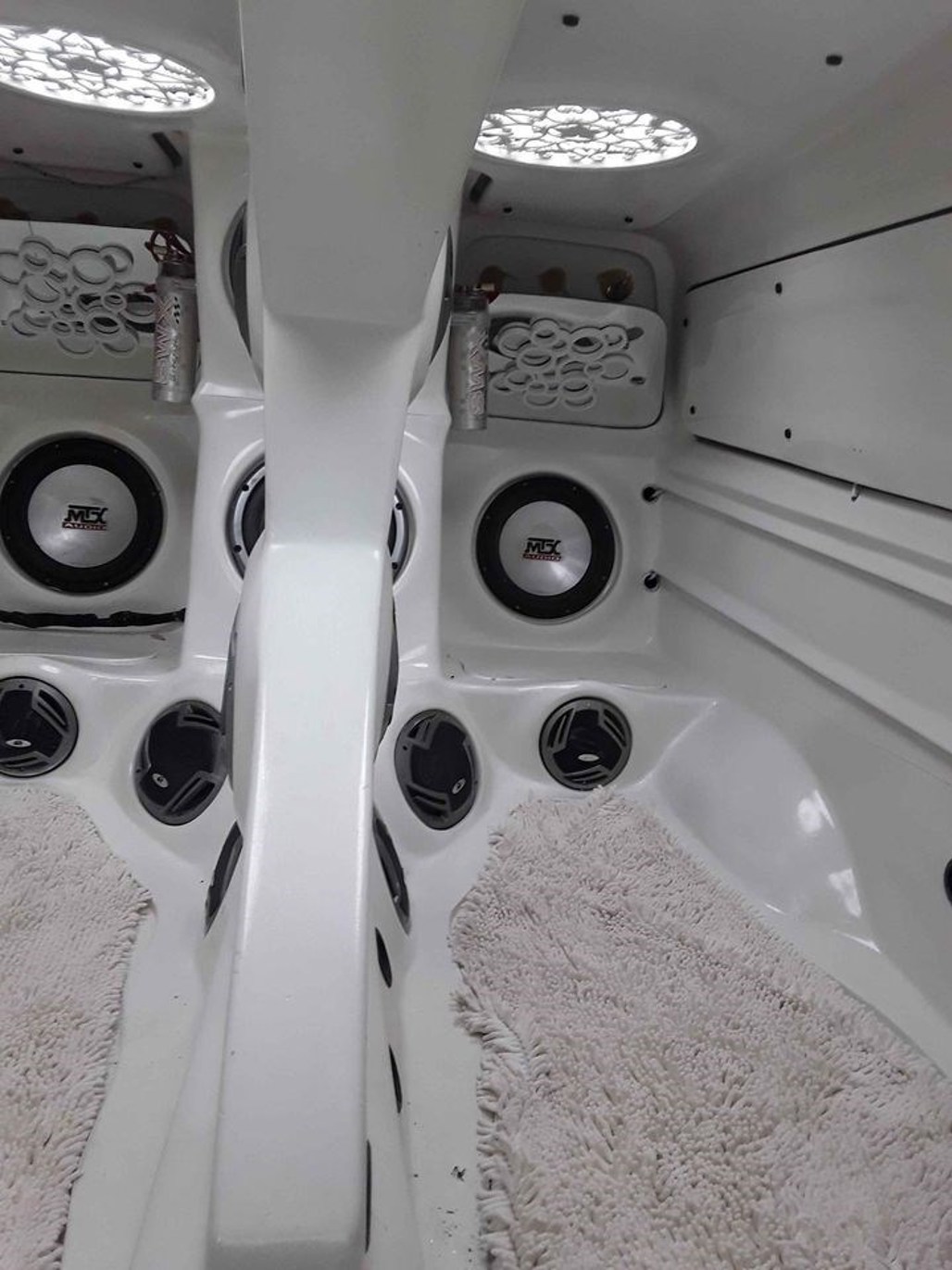 The front features a massive body-coloured grille and a pair of very distinctive headlights. The rear seats and passenger compartment have been removed, and in their place are two large white plastic areas sporting speakers and skylights. At the rear, you'll find 17 vertical LED lights and an area for even more speakers.