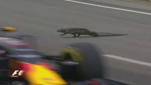 No, it’s true; during the third qualifying session, a rather large monitor lizard was seen ambling — then galloping — across the Marina Bay circuit as a clutch of F1 cars barrelled down upon it.