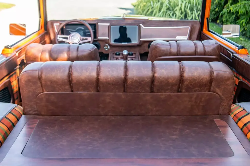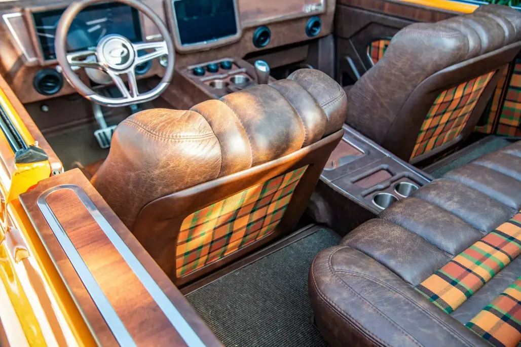 The cabin mirrors the exterior’s ambition. A digital instrument cluster and large central infotainment screen bring modern functionality, while dark brown leather wraps the dashboard, seats and transmission tunnel. Colourful fabric accents add contrast, joined by an aftermarket steering wheel and a custom Alpine and JL Audio sound system.