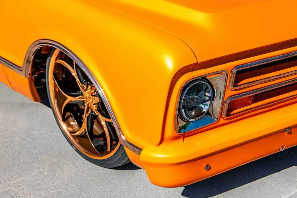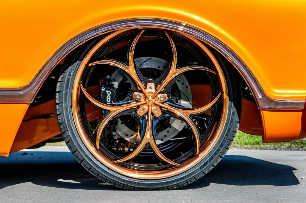 The exterior leans hard into visual theatre. The body is finished in Arancio California, an eye-searing orange borrowed from Lamborghini’s colour book, and paired with 22-inch rose gold and black wheels. Big Wilwood brakes sit behind them, ensuring the stopping power matches the intent.