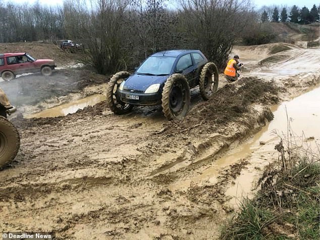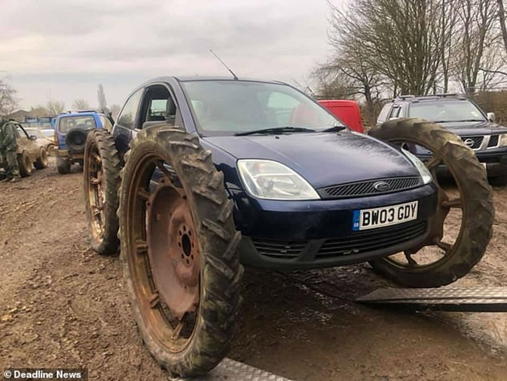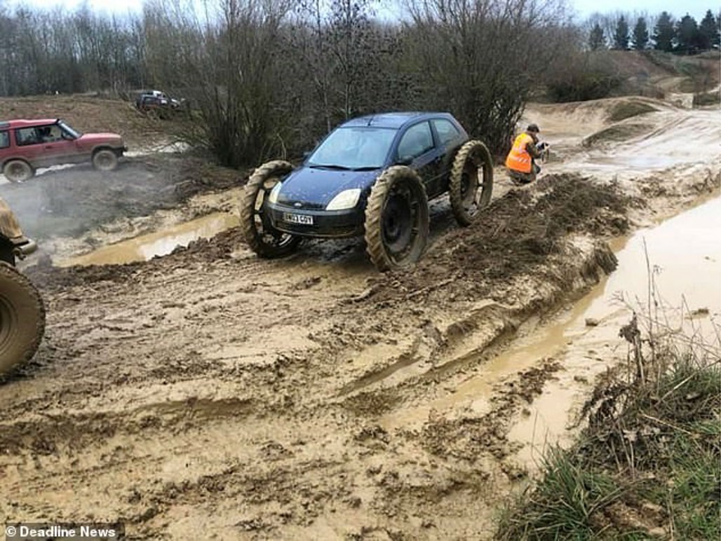 Charlie Burns attached a set of tractor wheels onto the Ford for just £84 and took the modified vehicle out for a spin along a muddy track at the Pay and Play event in Leicestershire.