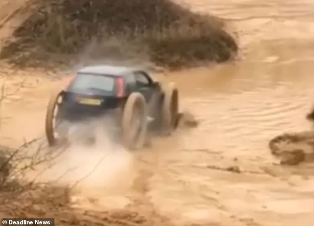 He spent five hours adapting the car so he could fit the wheels on and drive the vehicle. Mr Burns then filmed himself as he drove the car up steep, muddy slopes and deep water on the track. Other footage was filmed by one of his friends from a hilltop which captured all the action from vantage point.