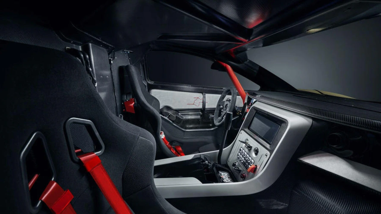 Inside, the vehicle’s racing pedigree is on display with bucket seats and a six-point safety harness.