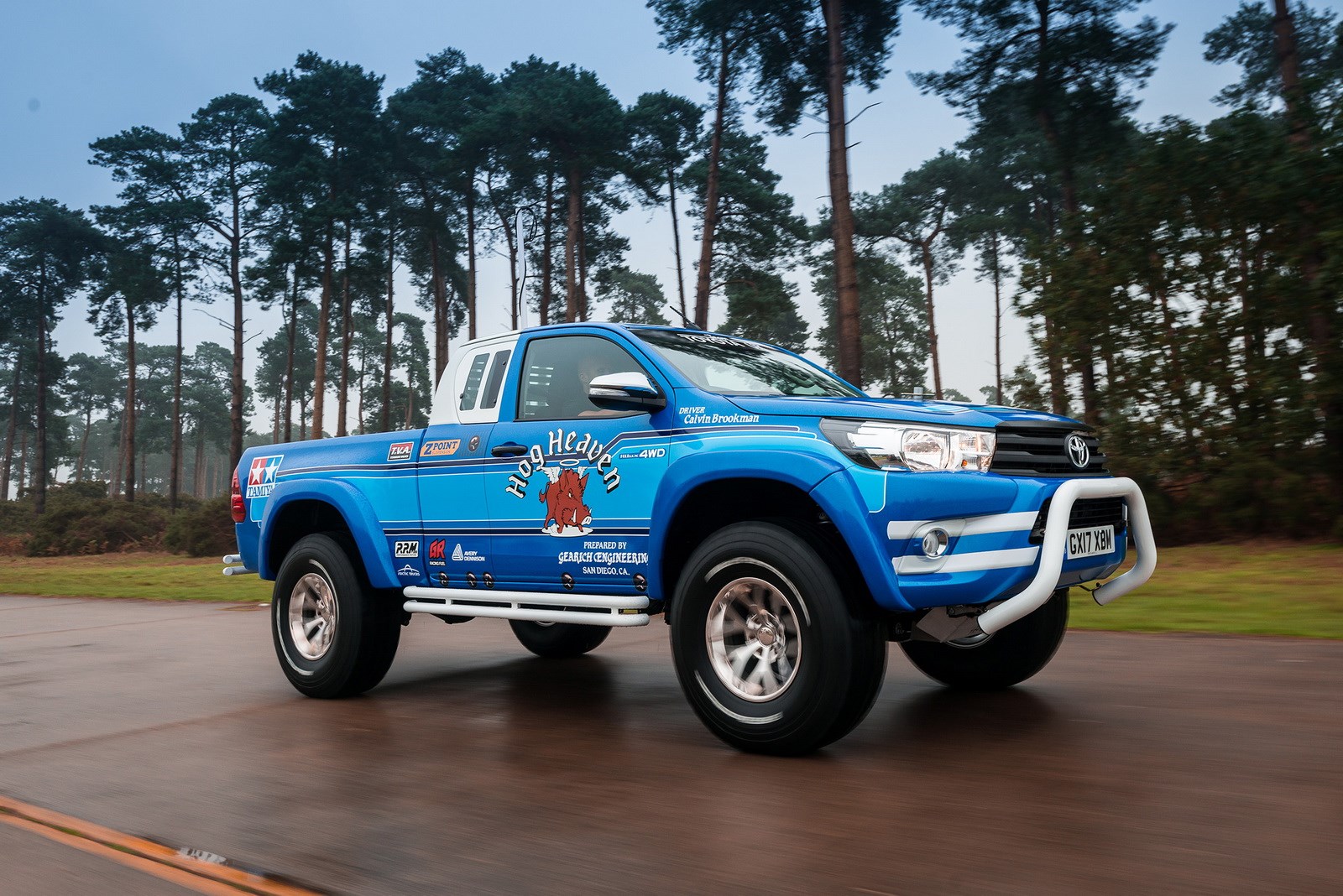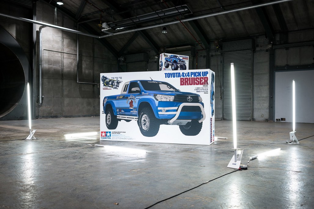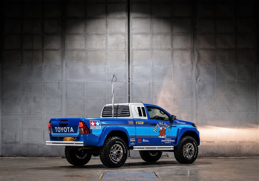 That label is a literal one ... the official name for this behemoth is 'Toyota Hilux Bruiser'. Is the same name, the same colour, and has the same stickers as a Tamiya remote control truck that once owned cult status in the UK as 'the toy to have' in the '80s.