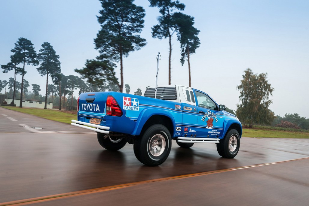 The rear window is louvered, and the chrome wheels nestled inside those meaty 35-inch tyres are a dead ringer for those on the remote control car. The tyres and lift are part of an upgrade by Arctic Trucks. If that name rings a bell, then you're probably a frequent viewer of Top Gear — where in an episode Clarkson and May took an Arctic Trucks–modified Hilux to the North Pole.