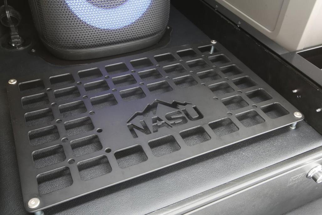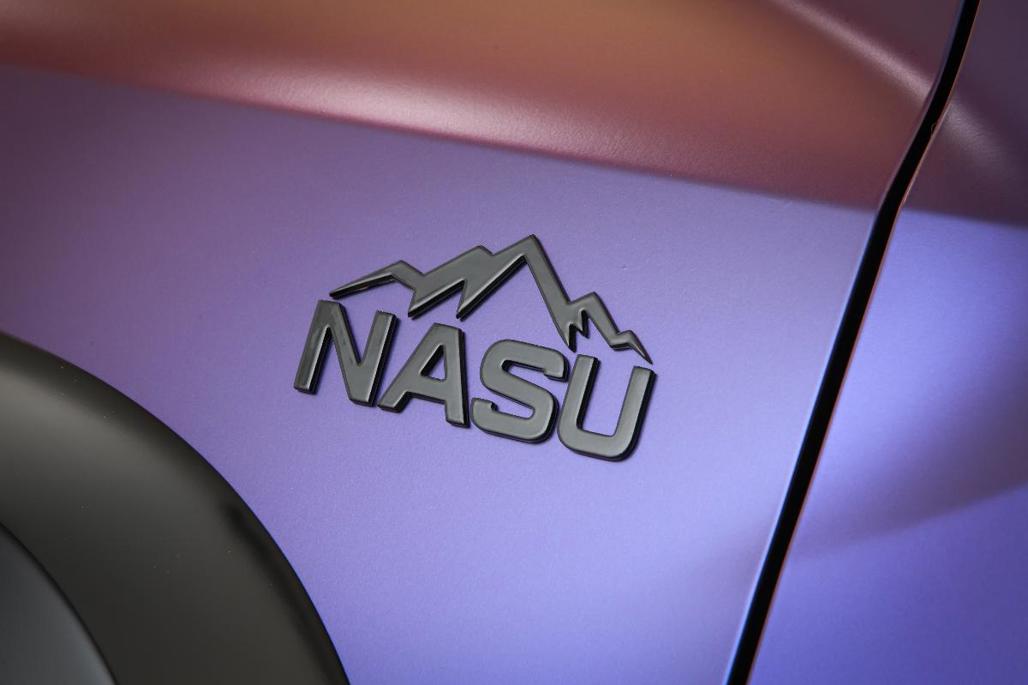 The exterior includes practical upgrades such as rock sliders, a cargo basket, and an articulating roof rack. A purple wrap pays homage to the Japanese word “nasu,” which also means “eggplant.”