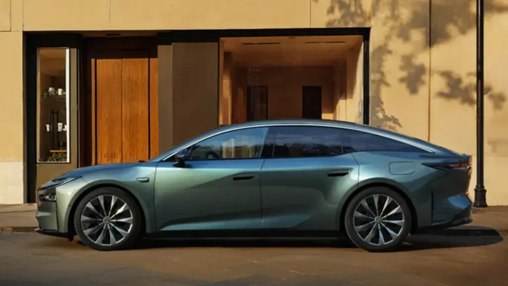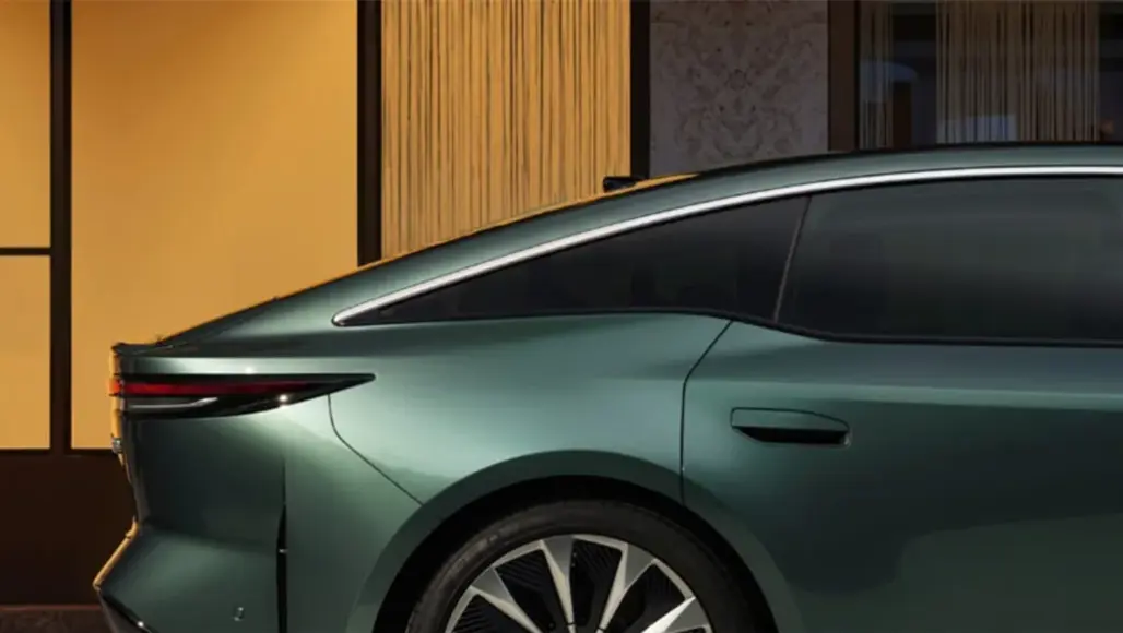 The side profile shows it has a fastback design with frameless doors, flush door handles and 21-inch alloy wheels.