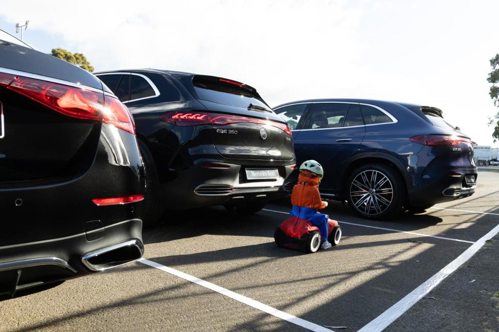 Exercise 2 was a showcase of robots and how not to hit them with various moving obstacles doing their best to be hit. Mercedes has developed a range of walking and riding humanoid adult and child robots to simulate and help mitigate a range of potential accidents. Our course sets up on the large Sandown carpark, with a standard autonomous 60km/h emergency stop before hitting the back of a simulated (soft) car, effectively getting us warmed up.