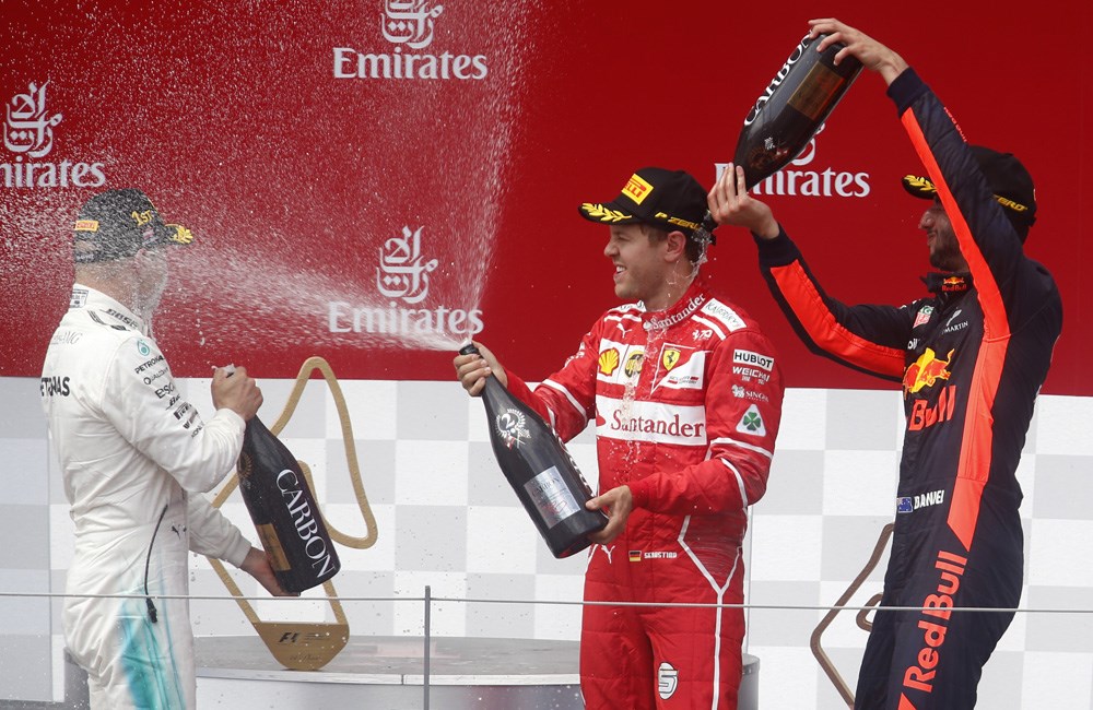 Mercedes driver Valtteri Bottas, Ferrari driver Sebastian Vettel and Red Bull driver Daniel Ricciardo of Australia, from left to right, celebrate on the podium of the Austrian Formula One Grand Prix