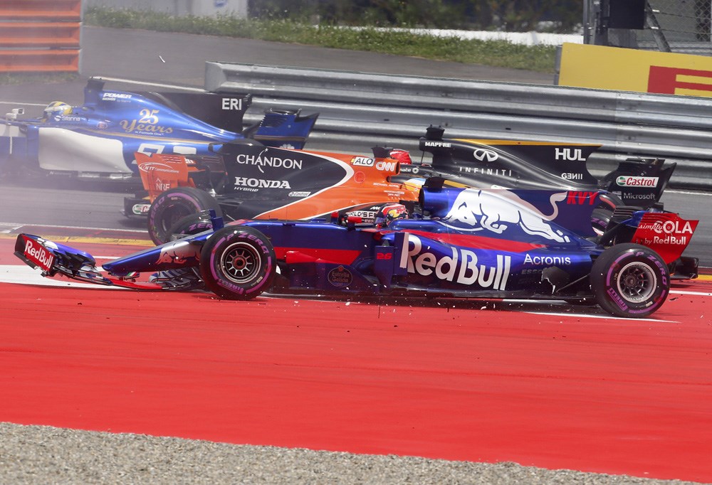 Toro Rosso driver Daniil Kyvat crashes with McLaren driver Fernando Alonso at the start of the Austrian Formula One Grand Prix.