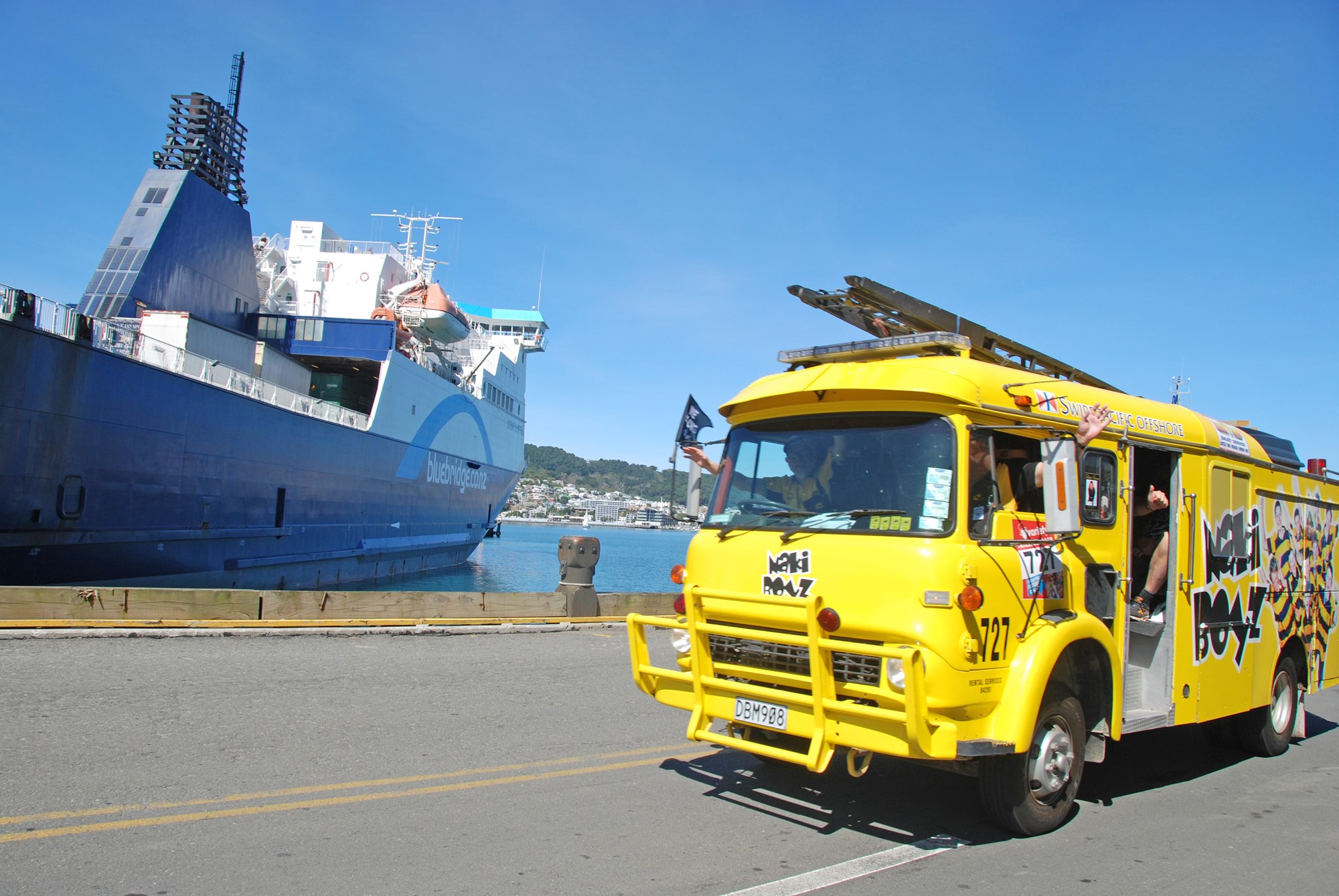 The line-up of colourful vehicles took a winding route via the Paekakariki Hill to the Bluebridge Ferry terminal, where they entertained children from the Bluebridge-supported charity, the Child Cancer Foundation, before boarding the ferry.