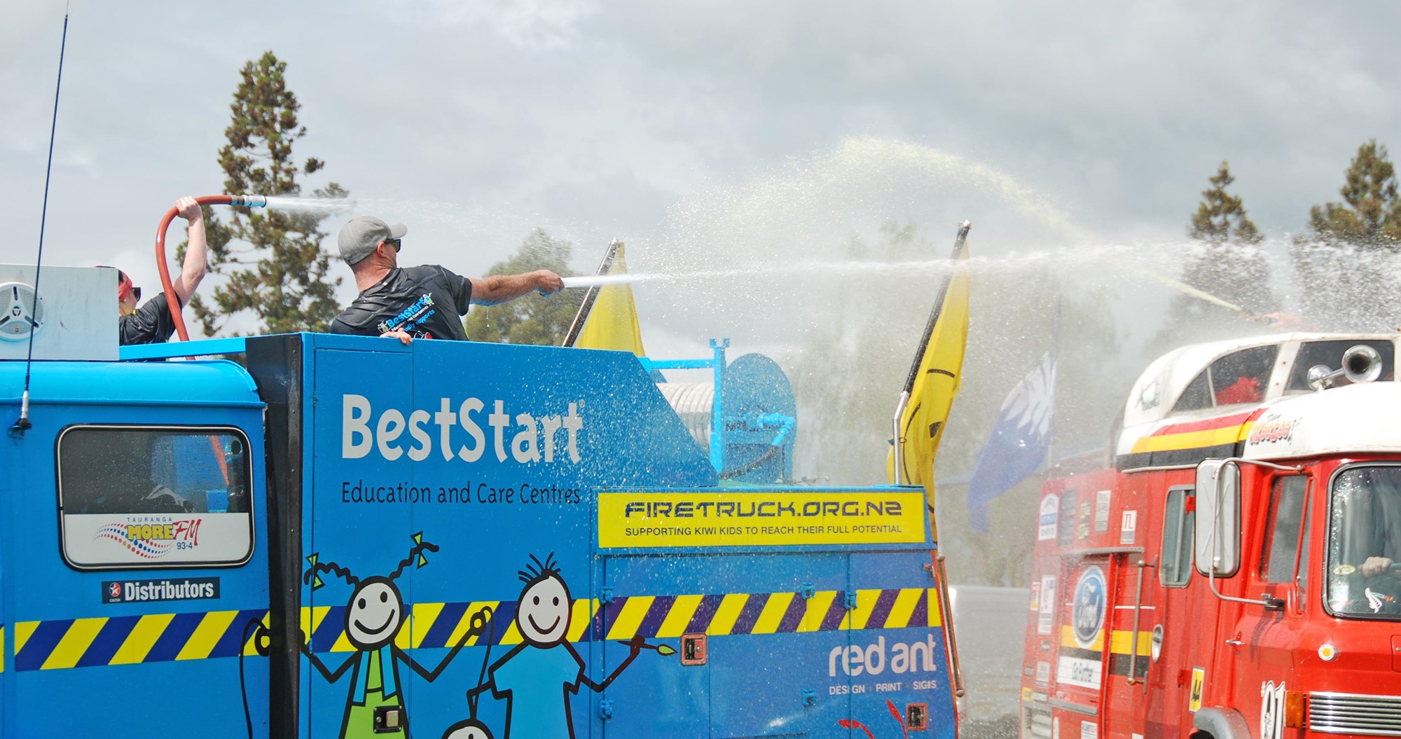 Kids and adults alike love watching fire-appliance water fights. Here BestStart (Tauranga) takes on Mooloo (Cambridge) on Waipa School playing field Picture/ Jacqui Madelin.