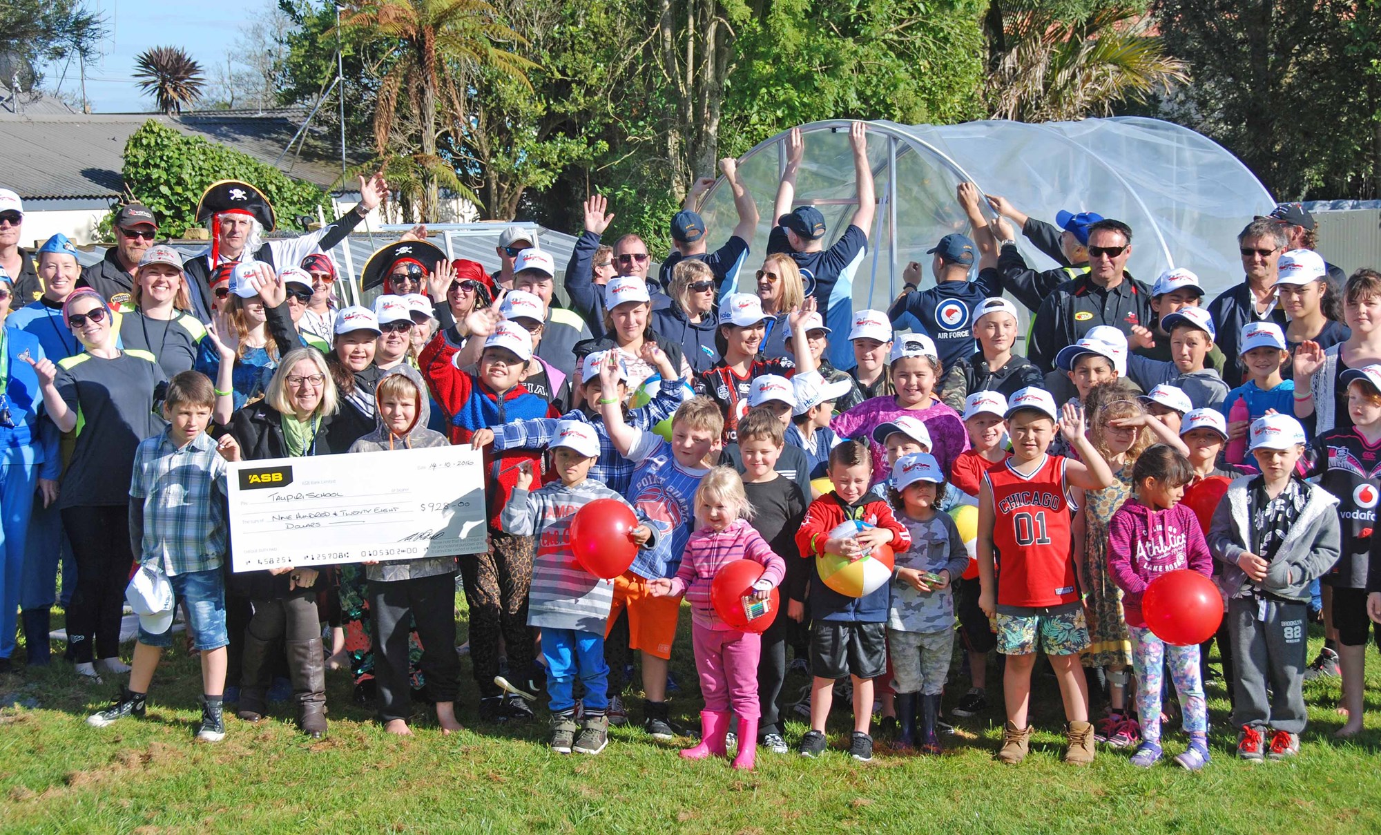 Taupiri School Deputy Principal Cindy Yelling with the cheque donated to the school for a greenhouse, and some of her pupils - inside the structure being erected behind them by volunteers from the NZAF. Several nominated children also received BMX bikes during the Variety Trillian Mini Bash visit. Picture/Jacqui Madelin.