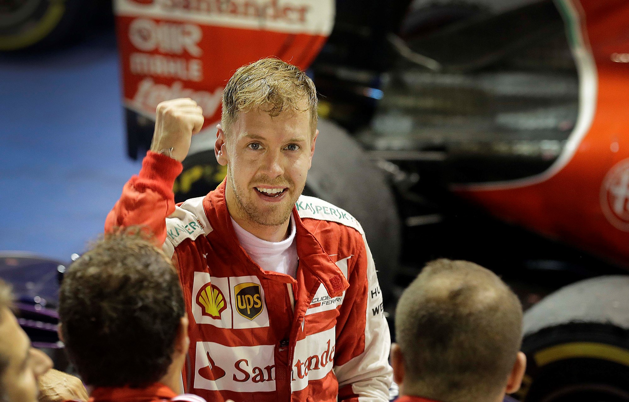 Ferrari driver Sebastian Vettel of Germany celebrates after winning the Singapore Formula One Grand Prix last night. Picture/AP
