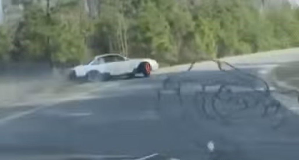 While it's rather hard to tell from the grainy footage, it looks like the car in question is an S14 Silvia wearing mismatched wheels for extra style points. Unfortunately for this guy, those style points don't translate to skill points on the tarmac.