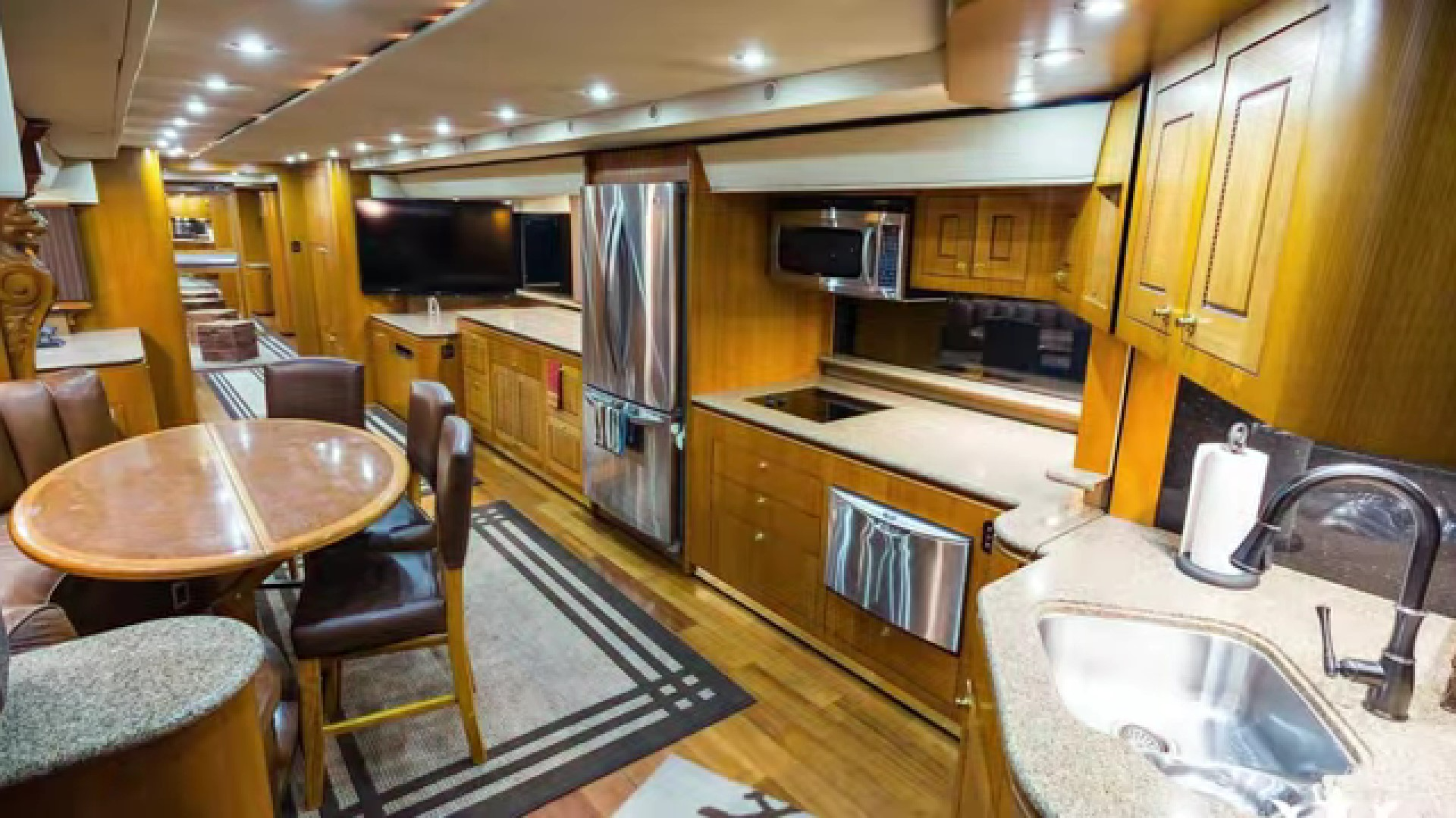 The RV is 1,200 square feet and contains not one, not two, but fouteen TVs, the largest of which is a 100-inch projection screen. Inside, you'll find $300,000 worth of leather and a $200,000 kitchen with a three-door fridge, dishwasher, and $125,000 of granite.