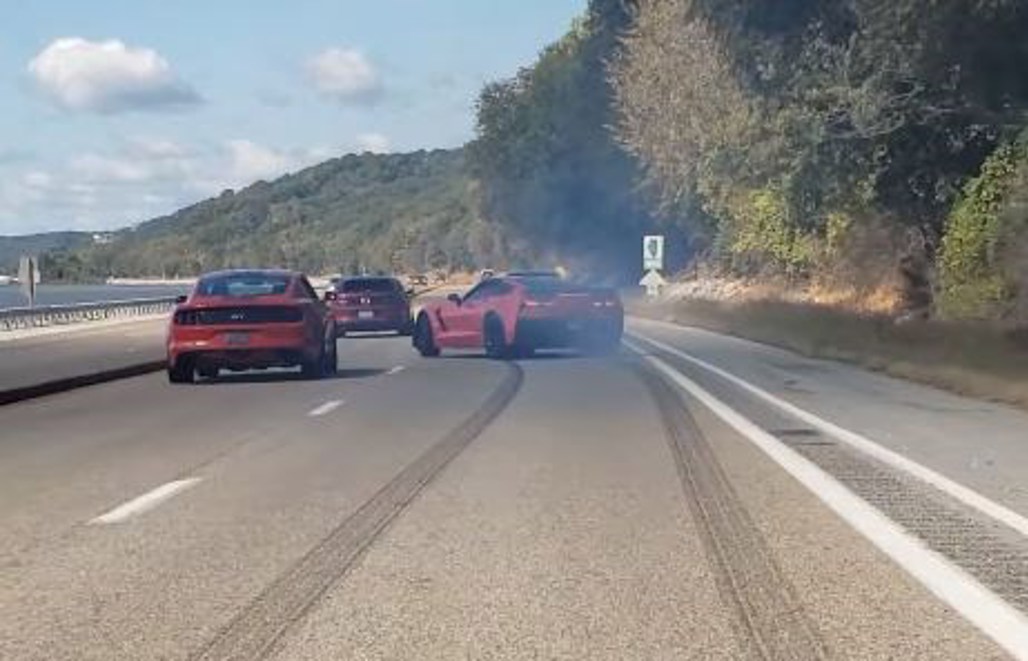 The dashcam footage starts by showing a Mustang lining up alongside a Chevrolet Corvette Z06 for a rolling drag race on a public road. This is the first red flag.