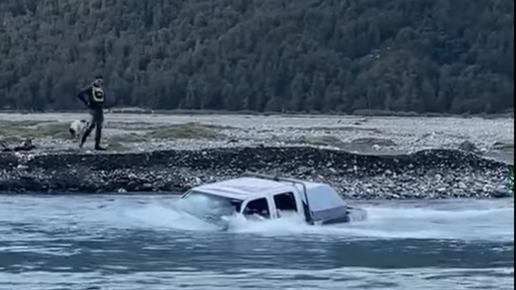 In the video posted first to Tik Tok and then on Facebook, a group of people attempt to cross a river near Mt Cook, Canterbury, in their truck when it is overcome with water and begins to float downstream.