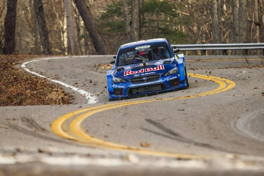 Red Bull shut the road down so that American race car driver Scott Speed, in a fully prepared Subaru rally car, could tackle it head first.