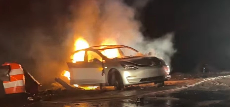 The video shows the battery fire, with 2170-type cylindrical battery cells popping out in all directions.