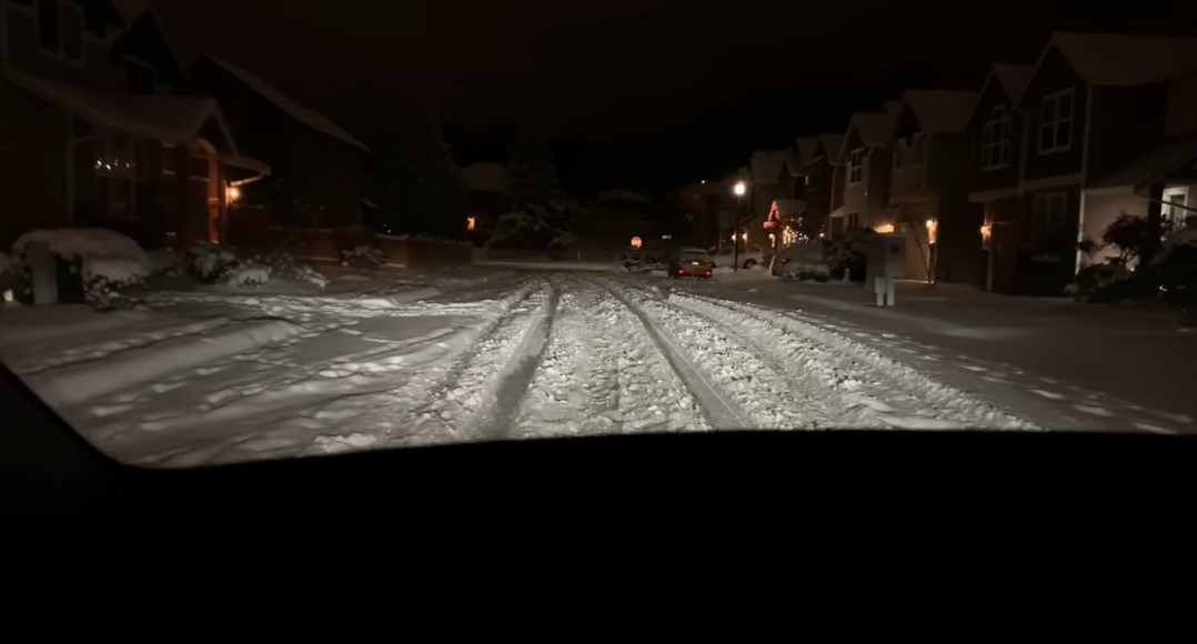 The car had 19" wheels with all-season tyres, and we can assume the car was an all-wheel drive. Initially, the driver was able to handle the snowy conditions. However, it began to slowly slip and slide uncontrollably down a particularly steep hill.