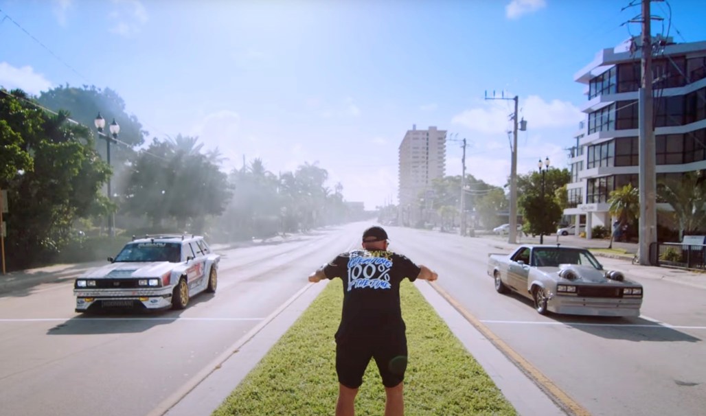 But wait, there's more. Pastrana also performs stunts like jumping over a helicopter that's hovering between two sides of a broken bridge, tracking next to a fighter jet and racing YouTuber Cleetus McFarland and his 2237kW Chevy El Camino.
