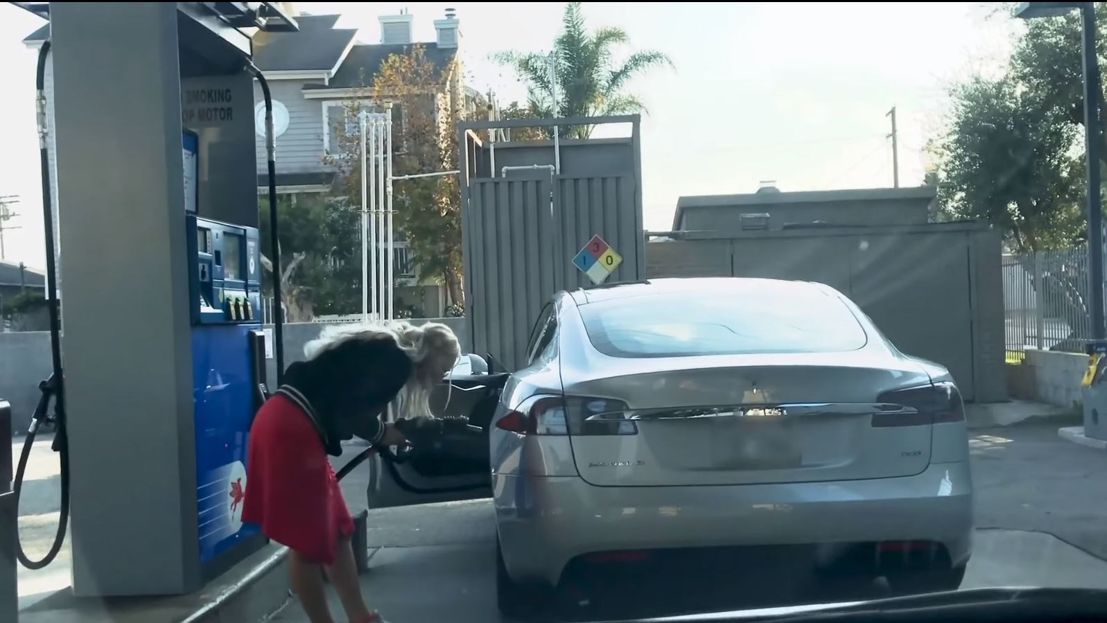 They laugh uncontrollably as she looks for a nozzle to fill her Telsa.