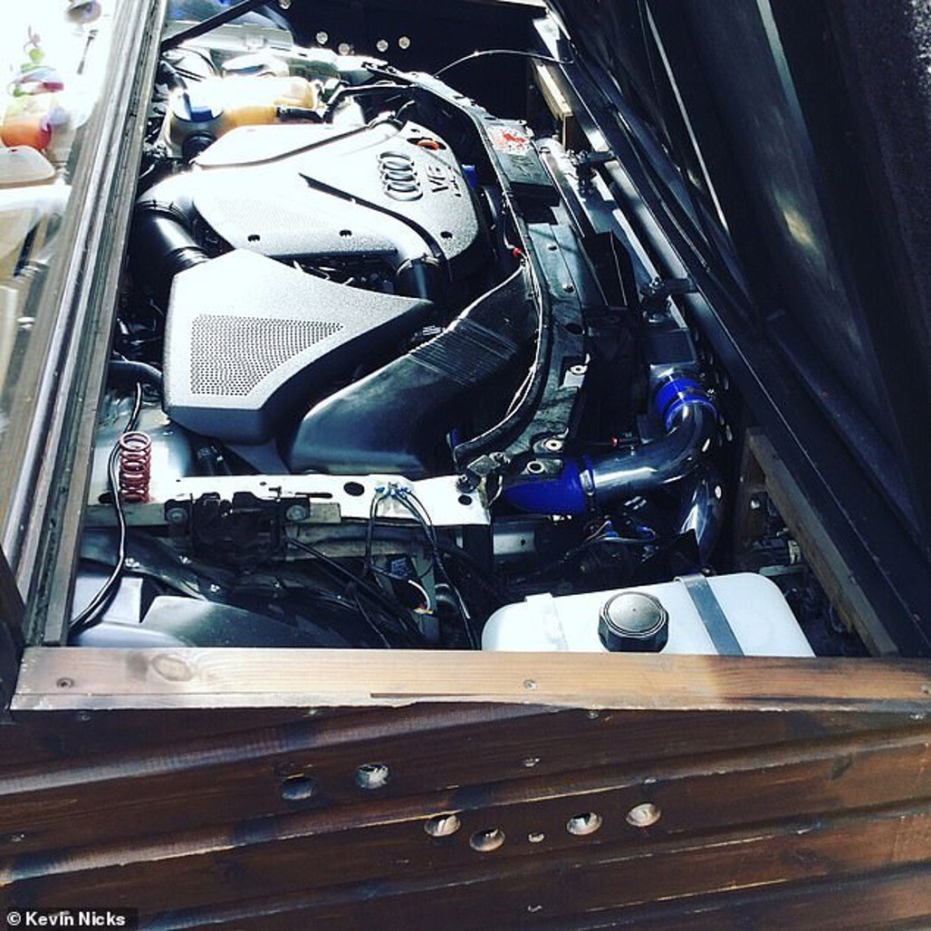 The Fastest Shed is fitted with a trick hydraulic system which makes the car 'go up and down', along with air conditioning, electric windows and remote central locking.