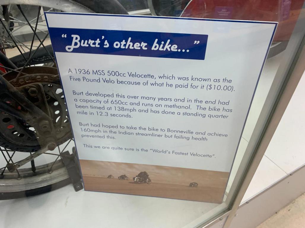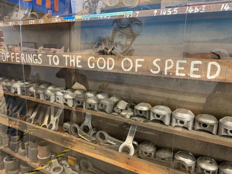 There is an abundance of Burt’s equipment, including his racing helmet and jacket, his “other bike”, the world’s fastest Velocette, and his “Offerings to the God of Speed” wall, where there are racks and racks of parts failures.