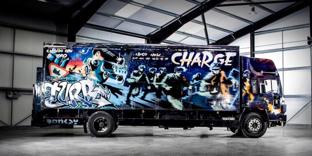 But what makes the truck so special is the graffiti is by British artist Banksy.and the work is called entitled Turbo Zone Truck (Laugh Now But One Day We'll Be in Charge), from 2000.