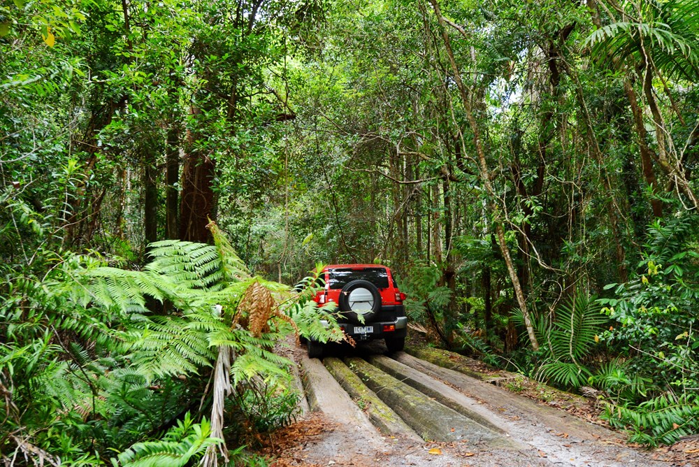 After a refreshing dip, we stretch our legs on the boardwalk track in the interior, taking in the unusual white sand creeks beneath a canopy of skinny satinay trees. Having become quite attached to Eunice, we’re almost reluctant to give her up. But the next day we swap for Dave’s Toyota FJCruiser (aka Frida Jane), celebrating our move when Eunice becomes bogged soon afterward. It doesn’t take long for the Cruiser to prove her superiority in the handling and comfort stakes, although there’s arguably less skill involved in driving her, the “crawl control” function keeping things slow and steady as we traverse the trickiest terrain.