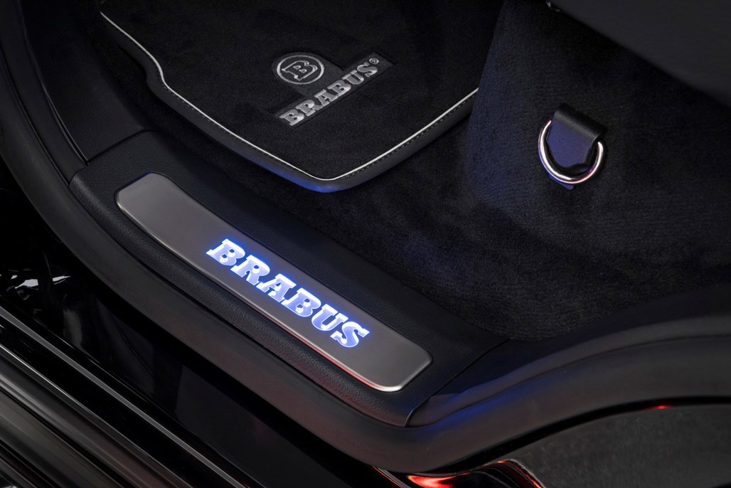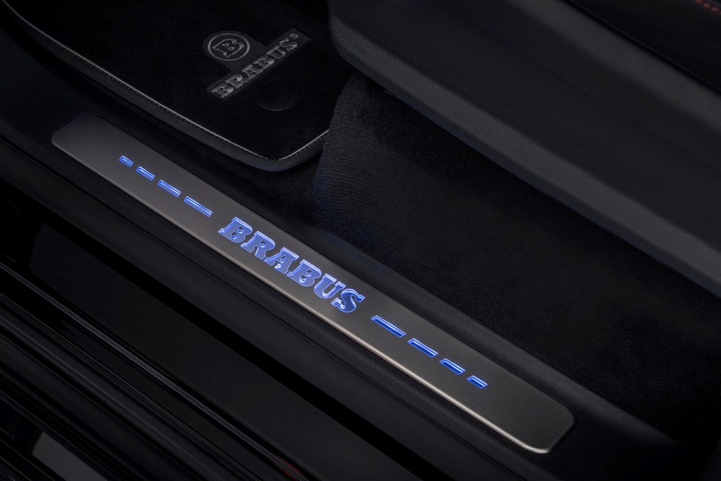 In the body department, Brabus fit a new front fascia attachment to give the production bumper a more striking profile and reduce front-axle lift at high speeds. The facelift also includes a new tailor-made radiator grille that lights up in blue when the driver unlocks the car.