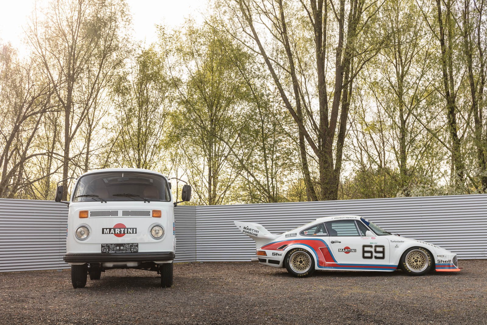 The second is, of course, a minty fresh second-gen Volkswagen T2 bus, dressed up in Martini Racing digs. It isn't just a van in drag, however. Previous owners swapped out its engine from the original donk to the 2.1-litre boxer power plant from a Porsche 914.