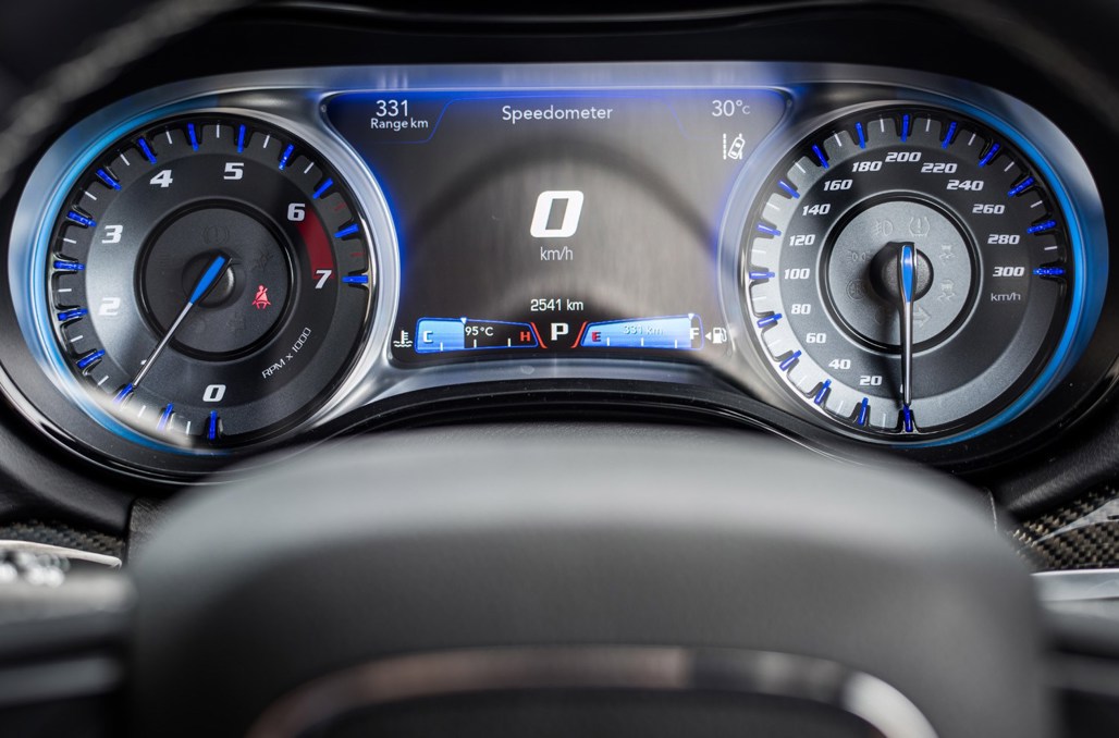 In front of the driver, bright and clear instruments (and a great hot rod-style font used in the cluster) provide all the data required, while you cannot fault the Uconnect touchscreen in the centre console for allowing simple, easy access to a wide variety of entertainment, comfort and vehicle settings (including interactive SRT 'Performance Pages' in the top model).