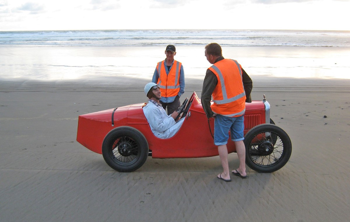 “Roger and the camera crew were in the bed of a ute driving at 100km/h down Muriwai Beach with Roger shouting “Faster, faster!” as the Austin rapidly caught up, overtook, and headed into the distance!”